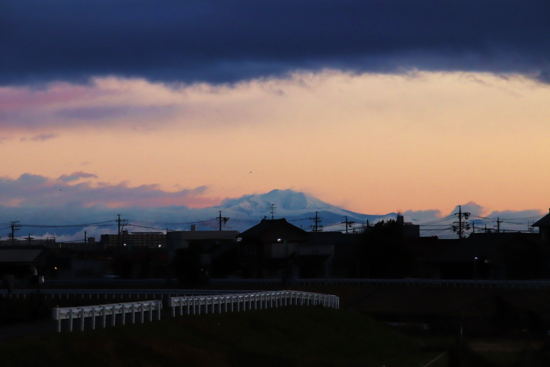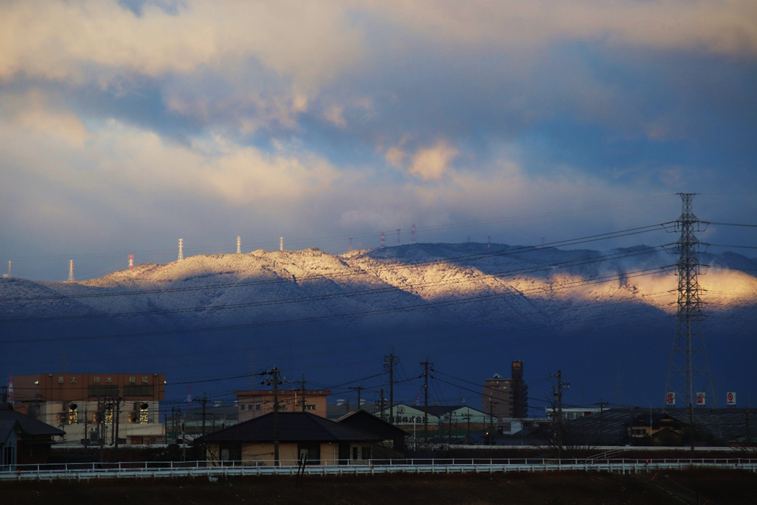 昨日まで黒々としていた養老山地の南部山稜。今日は白くなり漏れてきた日の光に光っていました。