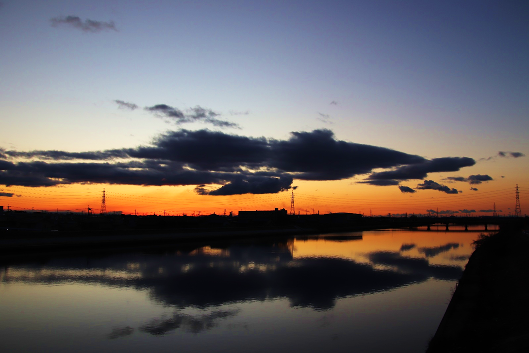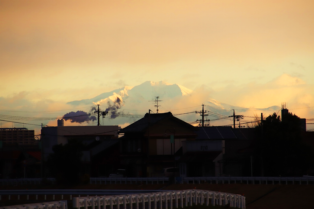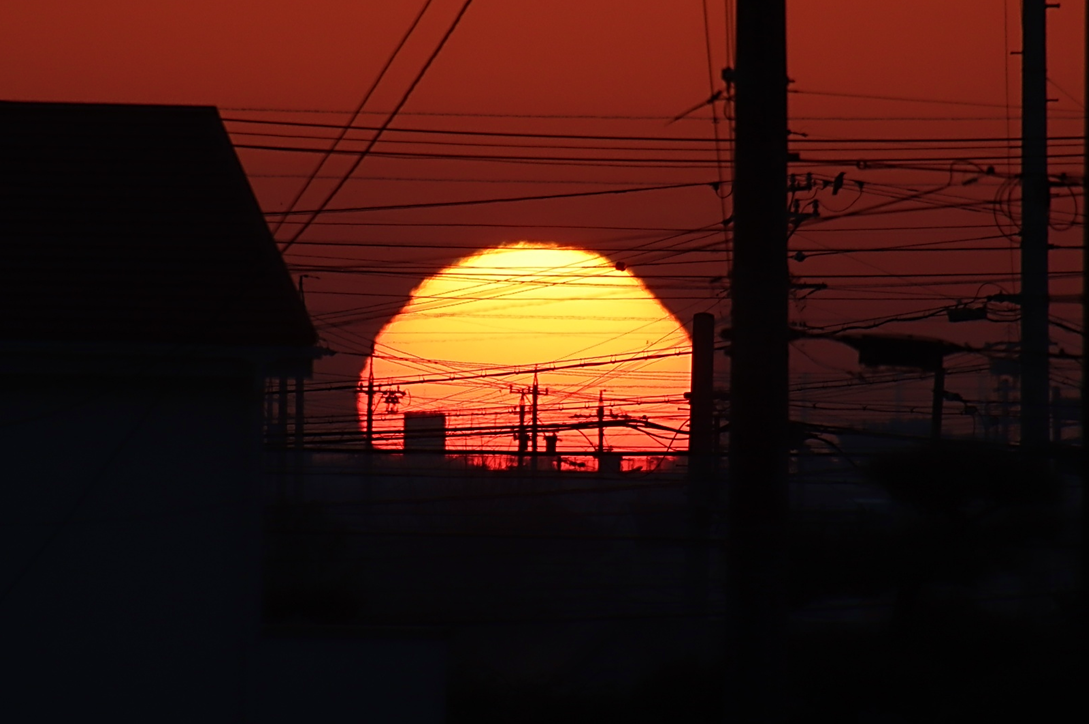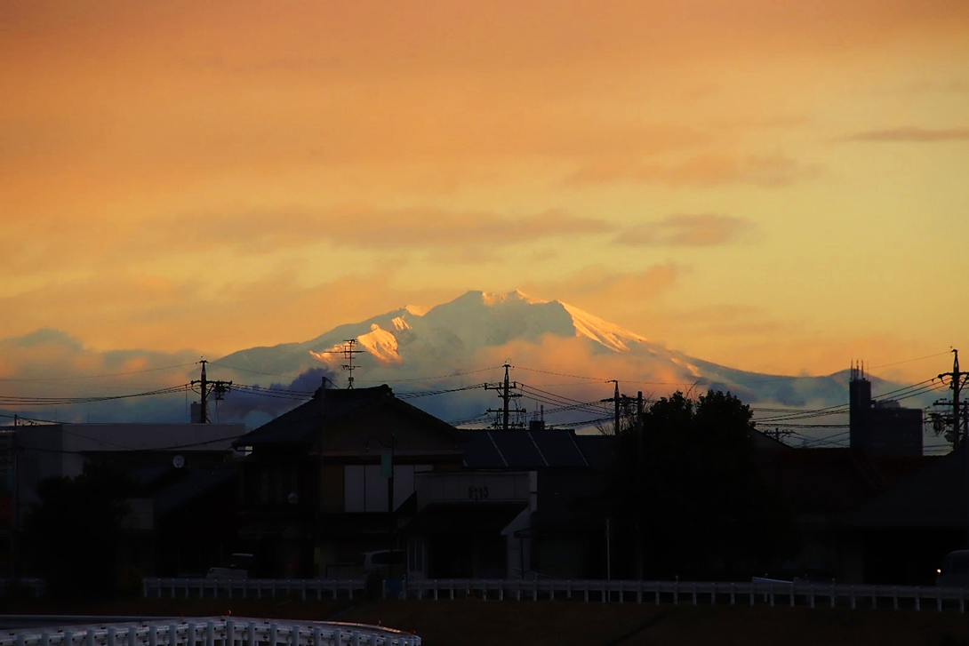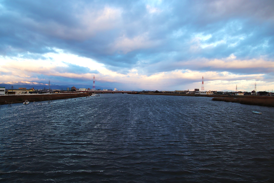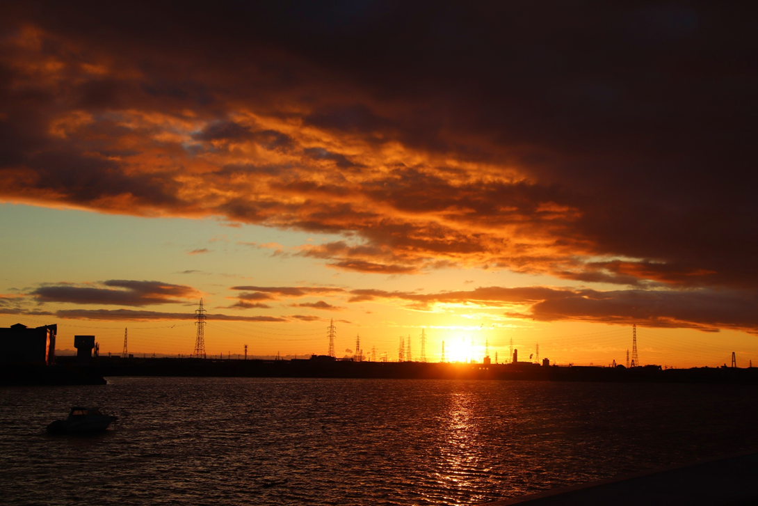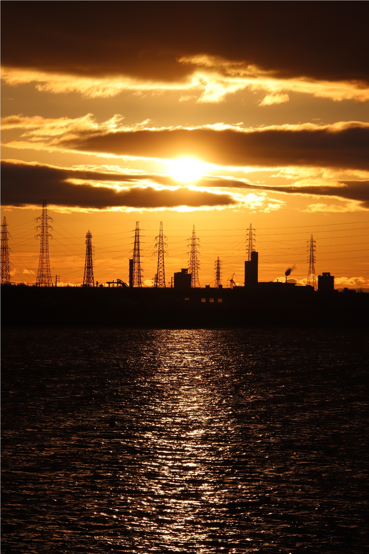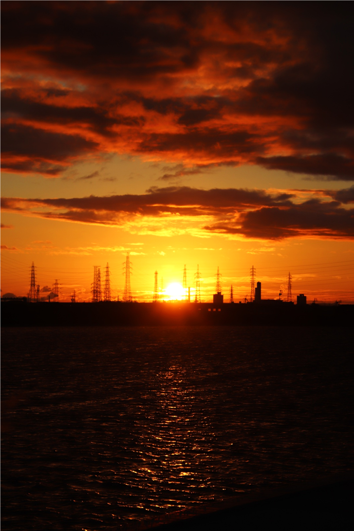 いつも朝日や山を拝んでいる場所の対岸に渡り、さらに川沿いに南へ少し下った所から撮影。北風が強く波立つ川面に光の道。大気も澄んでいて朝日がまぶしい。高圧鉄塔がなければ・・と思わないこともないですが、彼らも名古屋港を支えてくれています。
