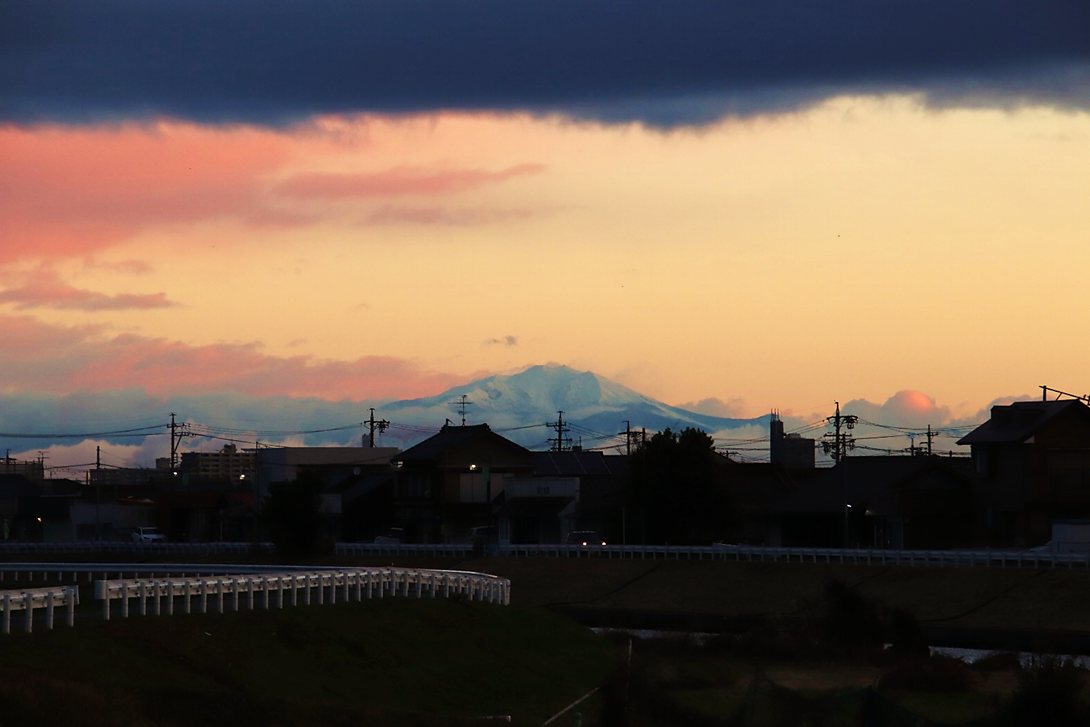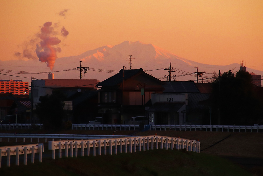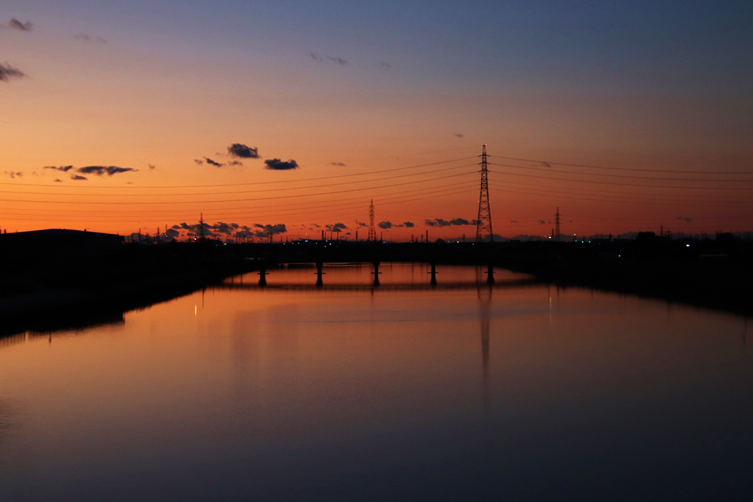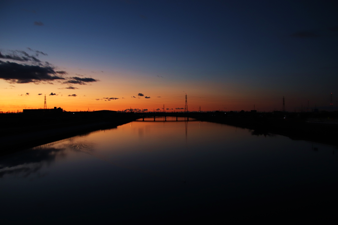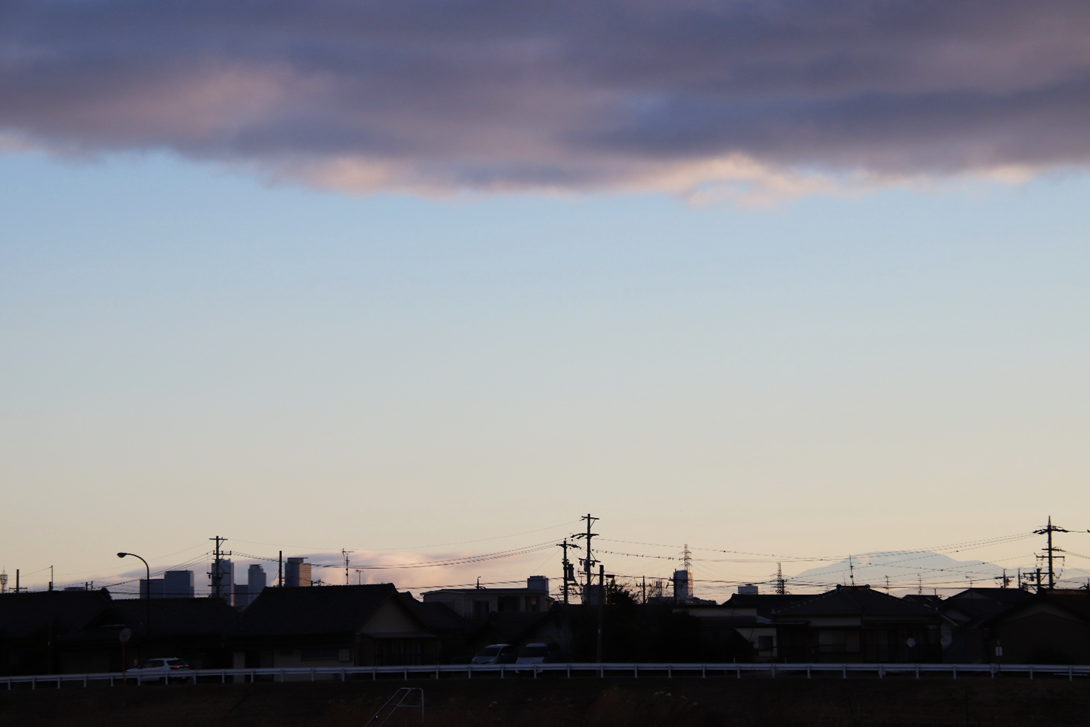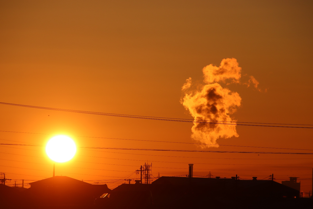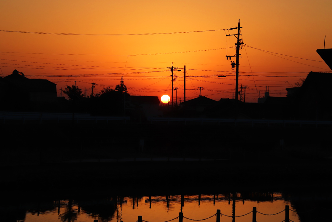 いつも朝日や山を拝んでいる場所の対岸に渡り、さらに川沿いに南へ少し下った所から撮影。北風が強く波立つ川面に光の道。大気も澄んでいて朝日がまぶしい。高圧鉄塔がなければ・・と思わないこともないですが、彼らも名古屋港を支えてくれています。