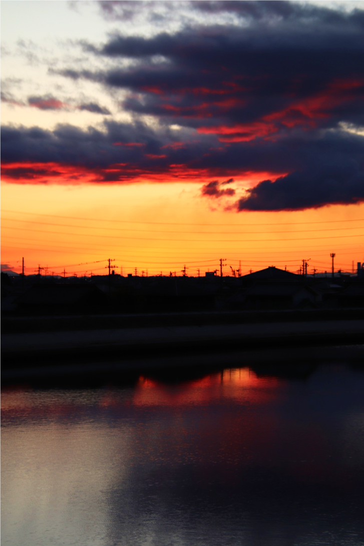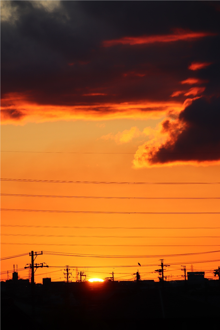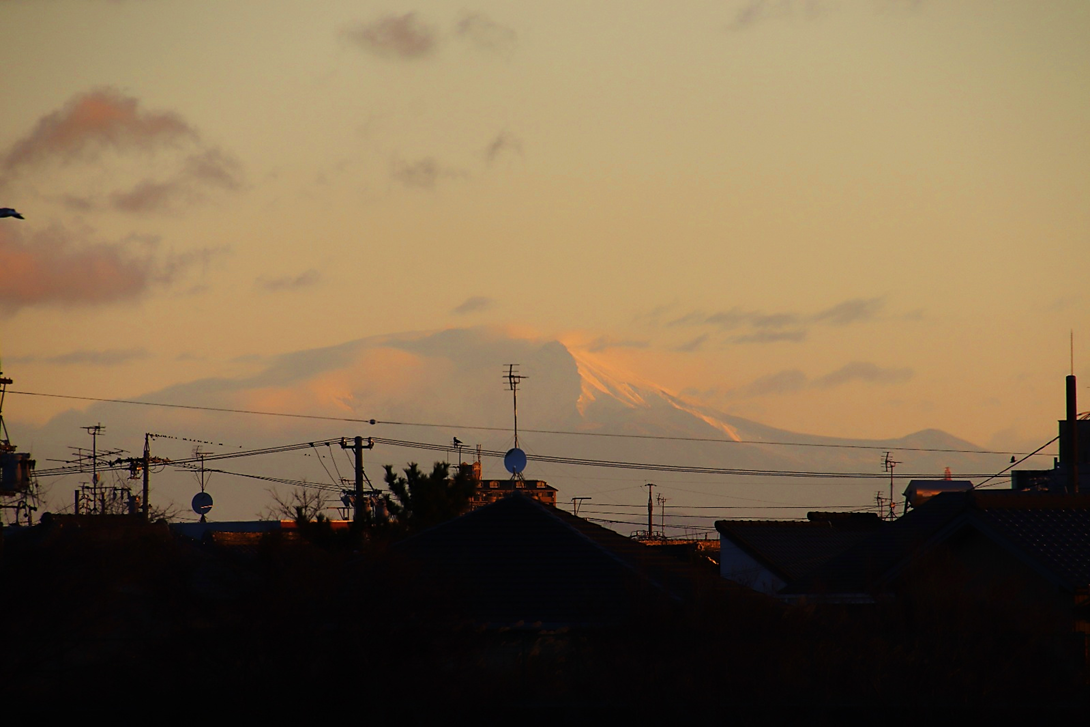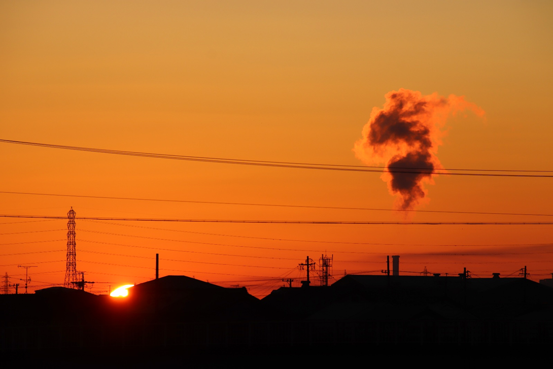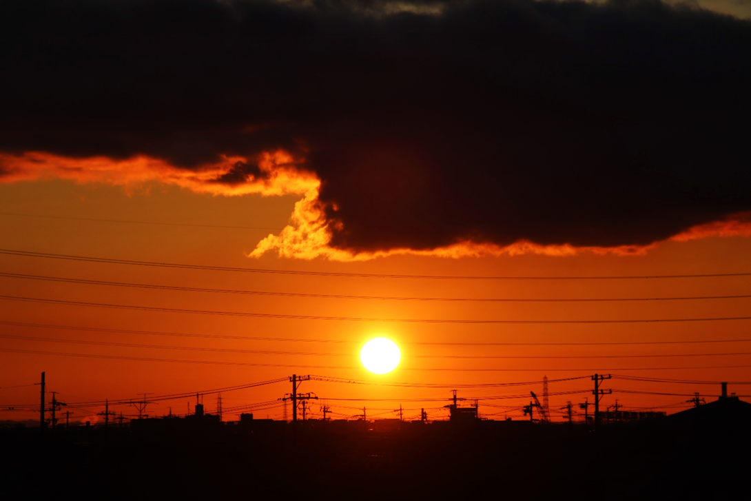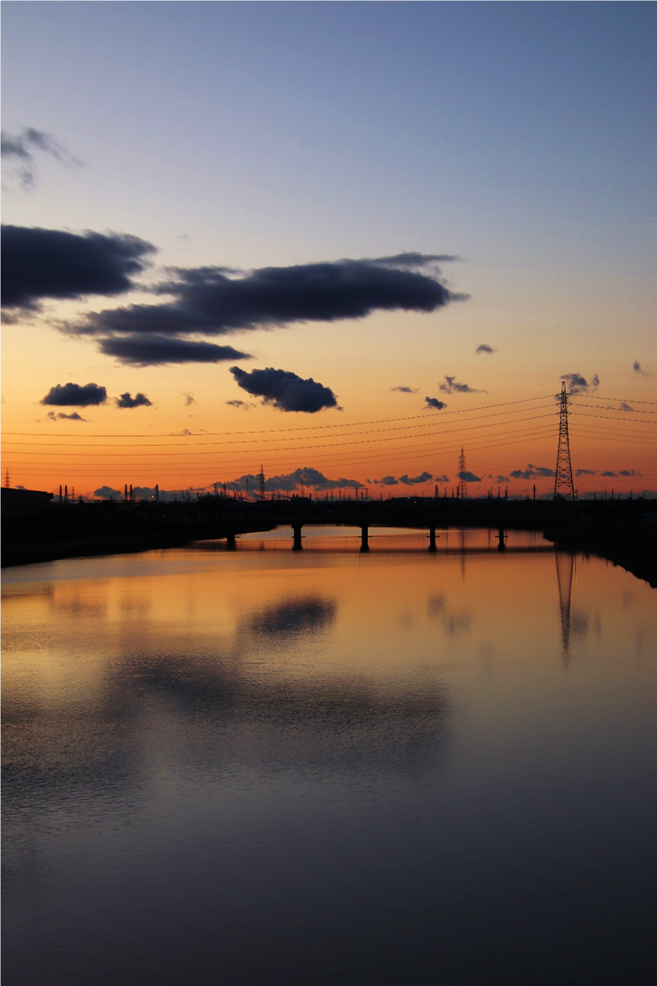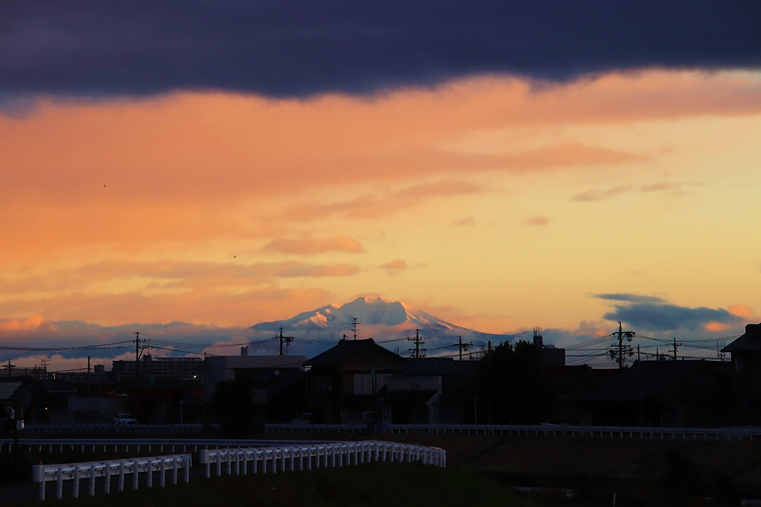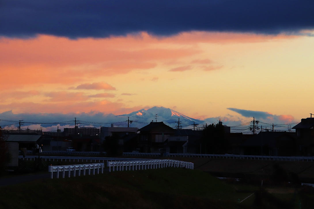 いつも朝日や山を拝んでいる場所の対岸に渡り、さらに川沿いに南へ少し下った所から撮影。北風が強く波立つ川面に光の道。大気も澄んでいて朝日がまぶしい。高圧鉄塔がなければ・・と思わないこともないですが、彼らも名古屋港を支えてくれています。