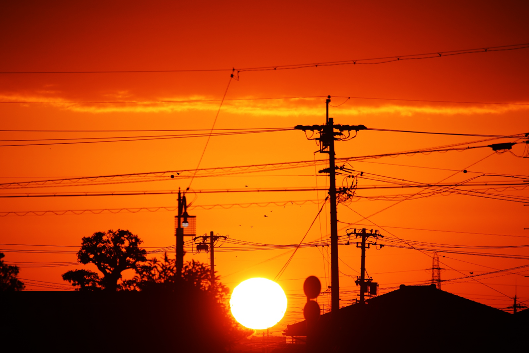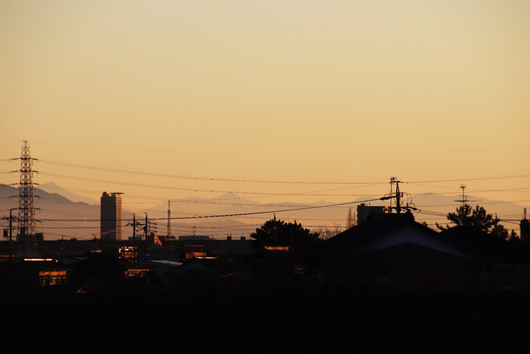 いつもより南に下ったところから見ているので、聖岳が猿投山から顔を出しました。左端の鉄塔の右の頂が聖岳。その前の色の濃い山は三河の猿投山。中央少し左の三角のピークが上河内岳。画面右の電信柱の右にみえるなだらかなピークが光岳。南アルプス南部は晴れています。
